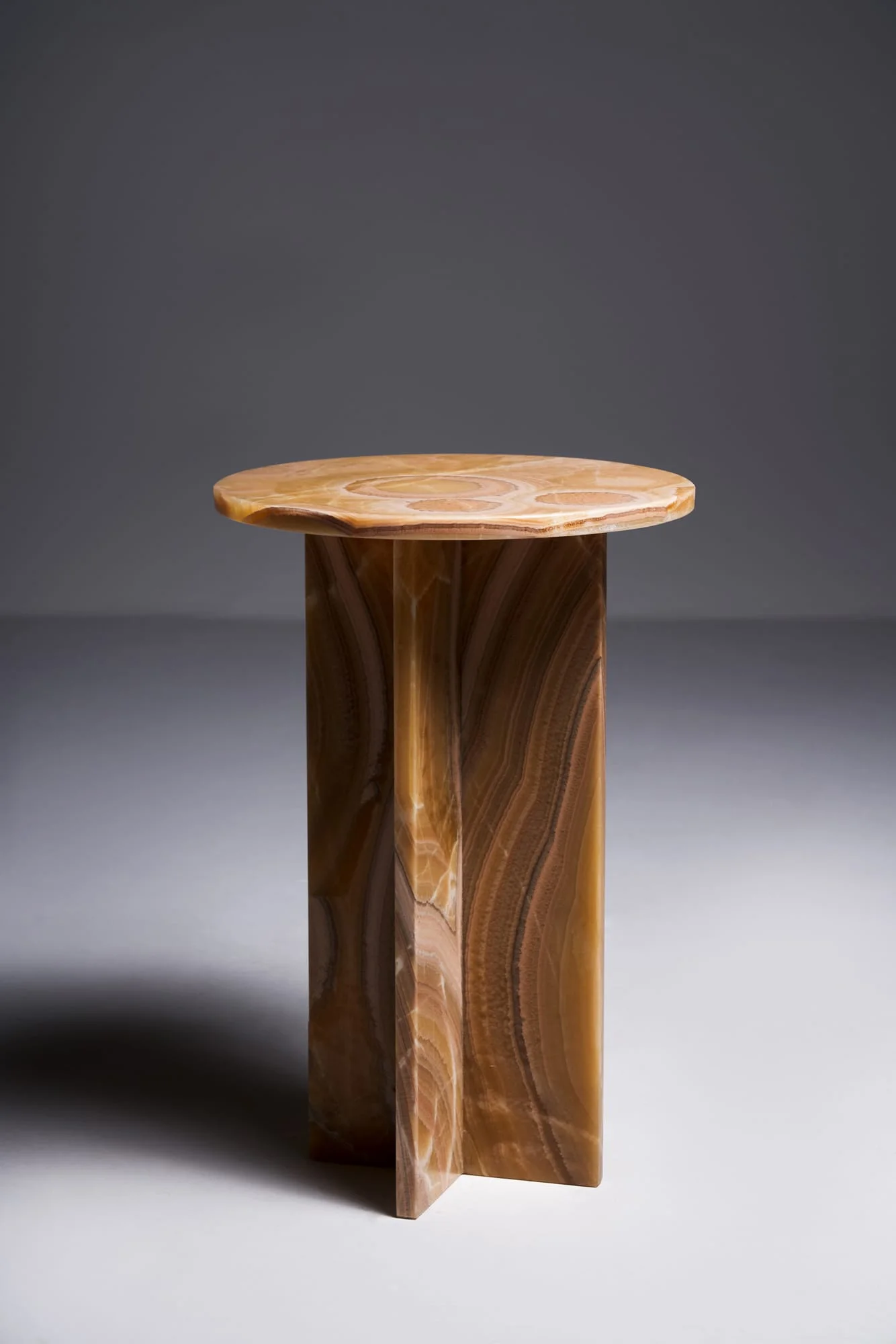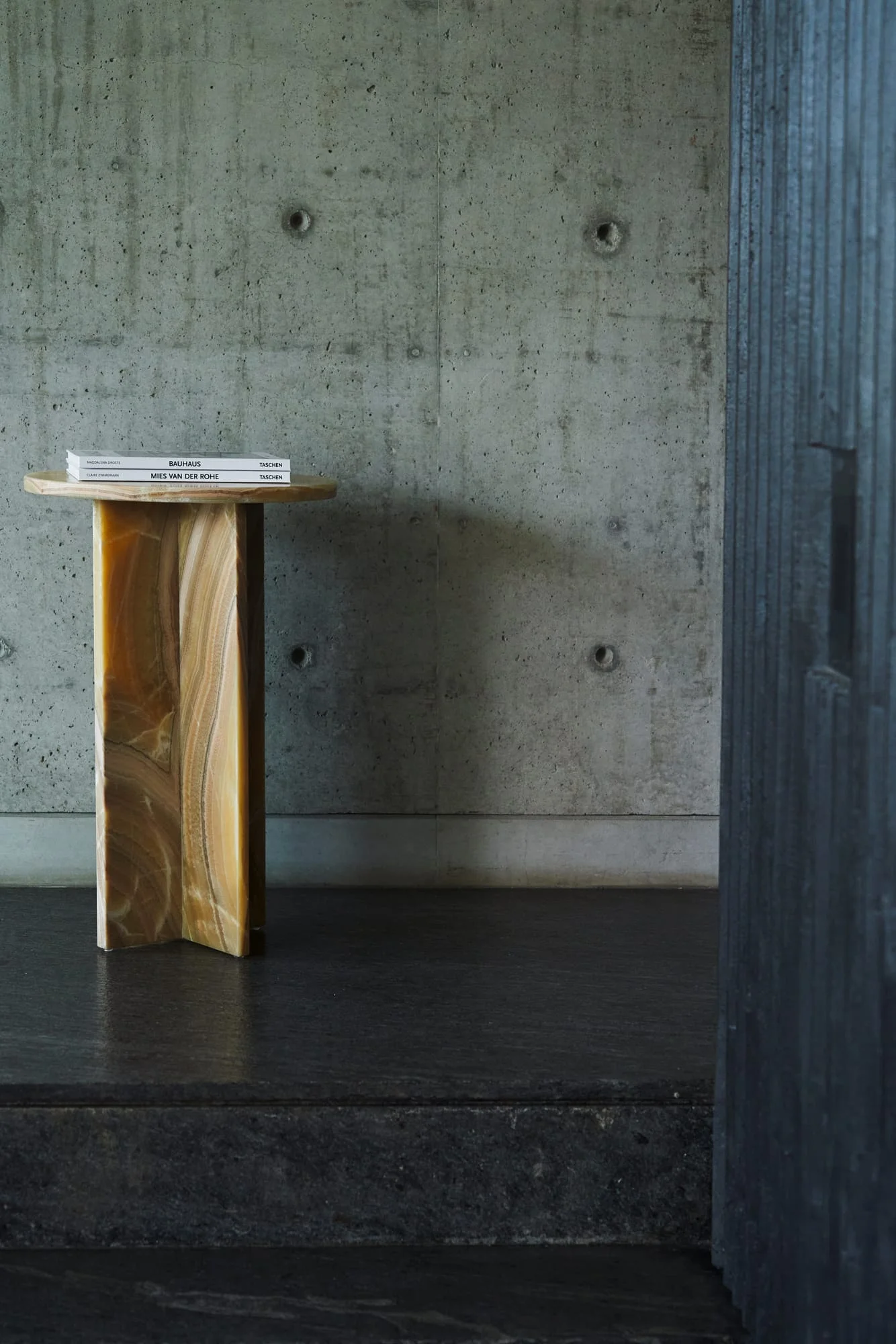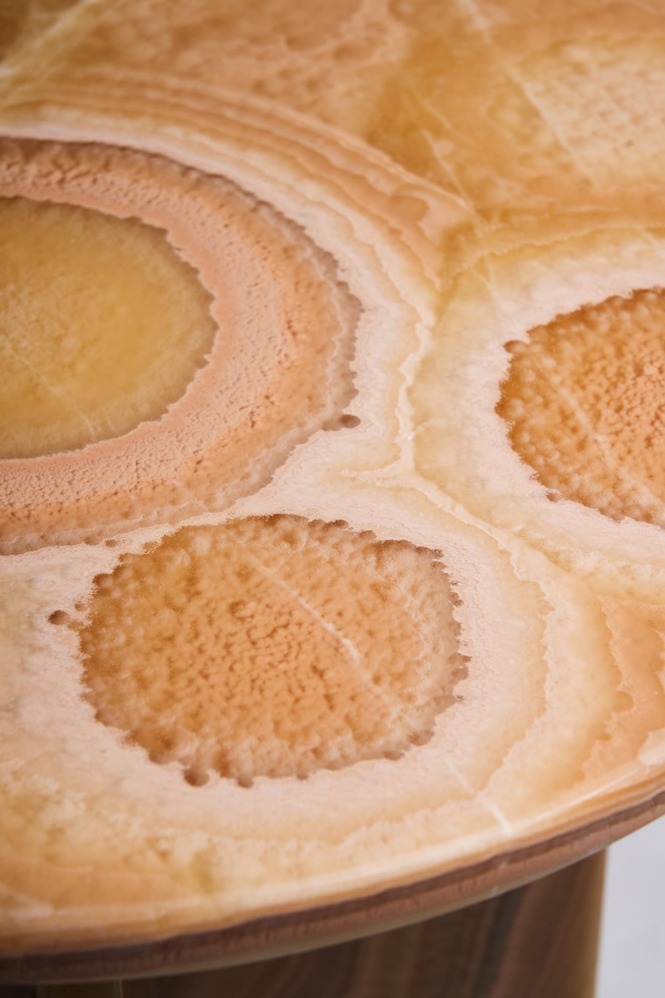 Der Mediator in Onyx Miel bringt Wärme, Licht und künstlerische Klarheit in den Raum. Seine runde Oberfläche ruht auf einem gekreuzten Sockel aus zwei massiven Steinelementen, die dem Tisch Haltung und Form geben. Onyx Miel ist ein goldfarbener, halbtransparenter Naturstein aus Mexiko, der durch seine lebendige Struktur, sanften Schichtungen und leuchtende Tiefe besticht. Die Steinplatte ist 2 bis 2.5 cm stark und wird sorgfältig von Hand veredelt – jedes Stück ist ein Unikat. Ob als Kaffeetisch zwischen zwei Sesseln oder als feiner Akzent im Eingangsbereich – der Mediator Miel bringt eine ruhige, warme Präsenz in jeden Raum und schafft eine Atmosphäre, die bleibt.